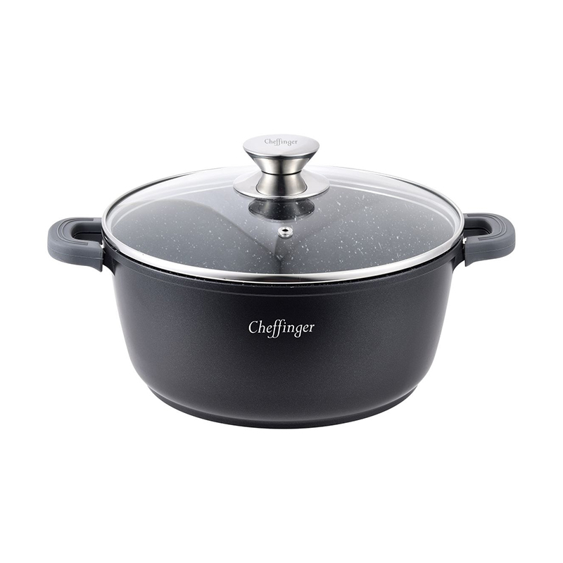 Cratita Cheffinger CF-DC28, 28 cm, 6 l, interior marmorat, capac sticla, manere silicon, Negru.