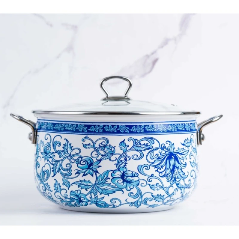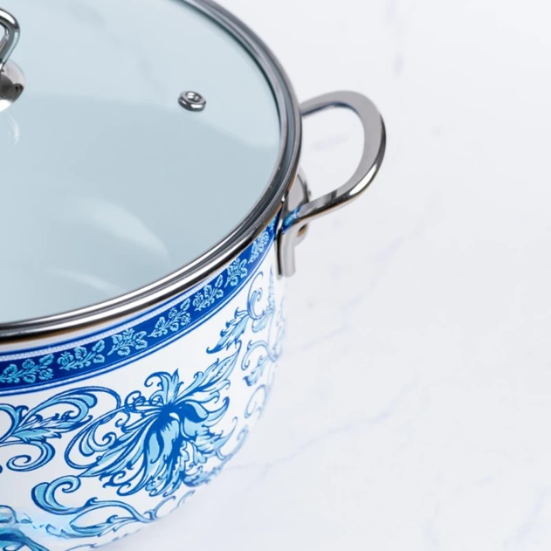 Cu nuantele sale de alb si albastru, cratita aduce o nota de eleganta si caldura in orice bucatarie. Forma clasica si manerele elegante din titan completeaza aspectul general, oferind o estetica deosebita.