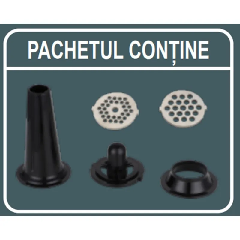 Contine elemente fabricate din otel inoxidabil, este usor de depozitat, este silentioasa si cu un design compact. Este prevazuta cu 2 site de marimi diferite. Pentru ca dispune de functia „reverse”, puteti debloca masina usor si rapid atunci cand se blocheaza cu resturi. Pentru a prepara carnati, masina este prevazuta cu tub special. Folosind masina de tocat MG5019, tocatul carnii va deveni o placere, deoarece folosind dispozitivul special de impingere totul se va desfasura in siguranta, fara teama de a va rani accidental.