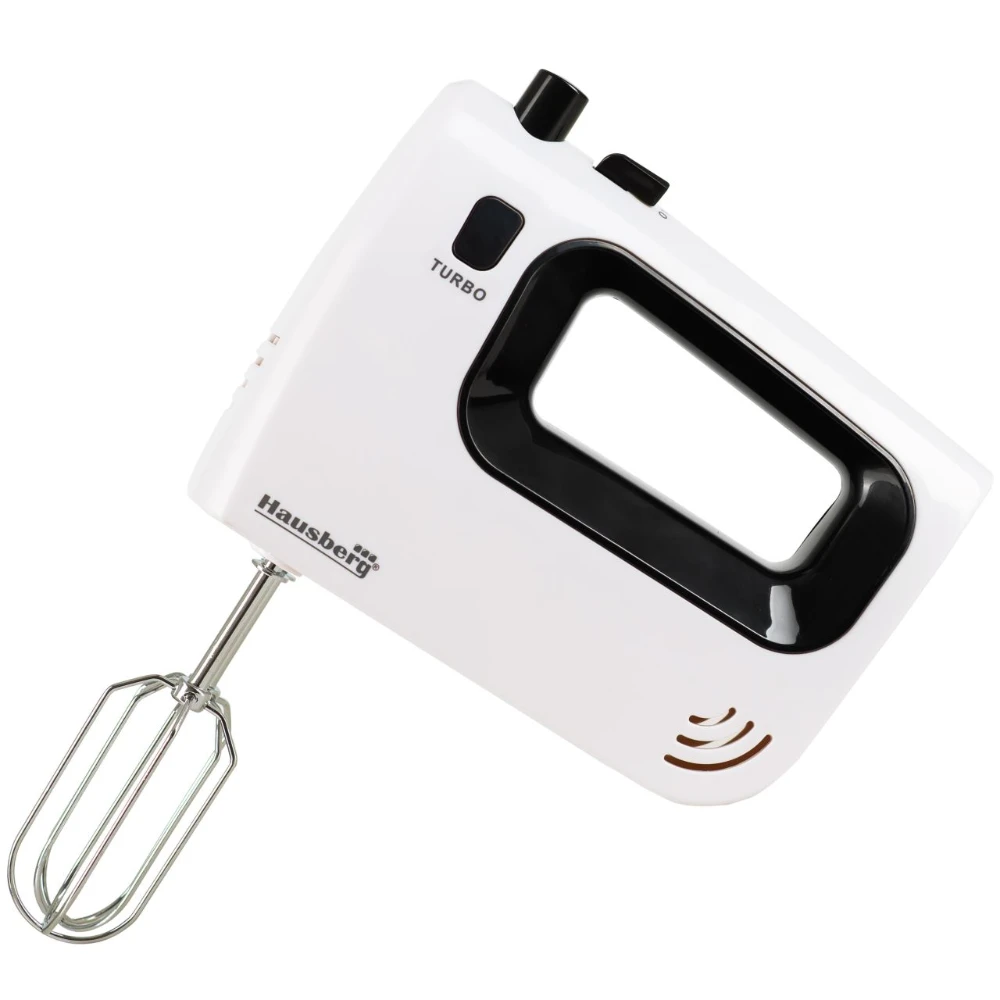 Mixer de mana Hausberg HB-4120NG, 300W ,5 viteze, functie turbo, teluri si carlige metalice, Negru/Alb. Mixerul de la Hausberg este partenerul dumneavoastra esential pentru produse de patiserie. De la baterea albusurilor de ou, prepararea friscai, amestecarea compozitiilor de prajituri si pana la framantarea aluaturilor.