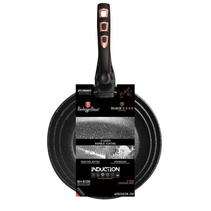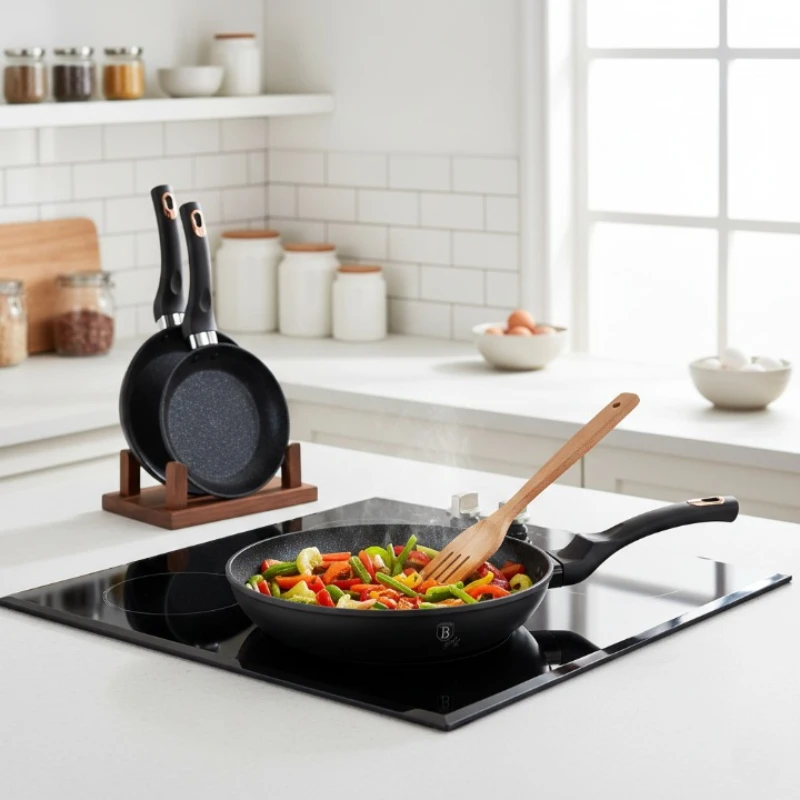 Echipază-ți bucătăria cu un set complet și versatil: Berlinger Haus BH-6158F. Acest set din colecția Black Rose Line îți oferă trei dimensiuni esențiale pentru orice rețetă, combinând durabilitatea aluminiului forjat cu eleganța unui design profesional, premiat pentru funcționalitate.
