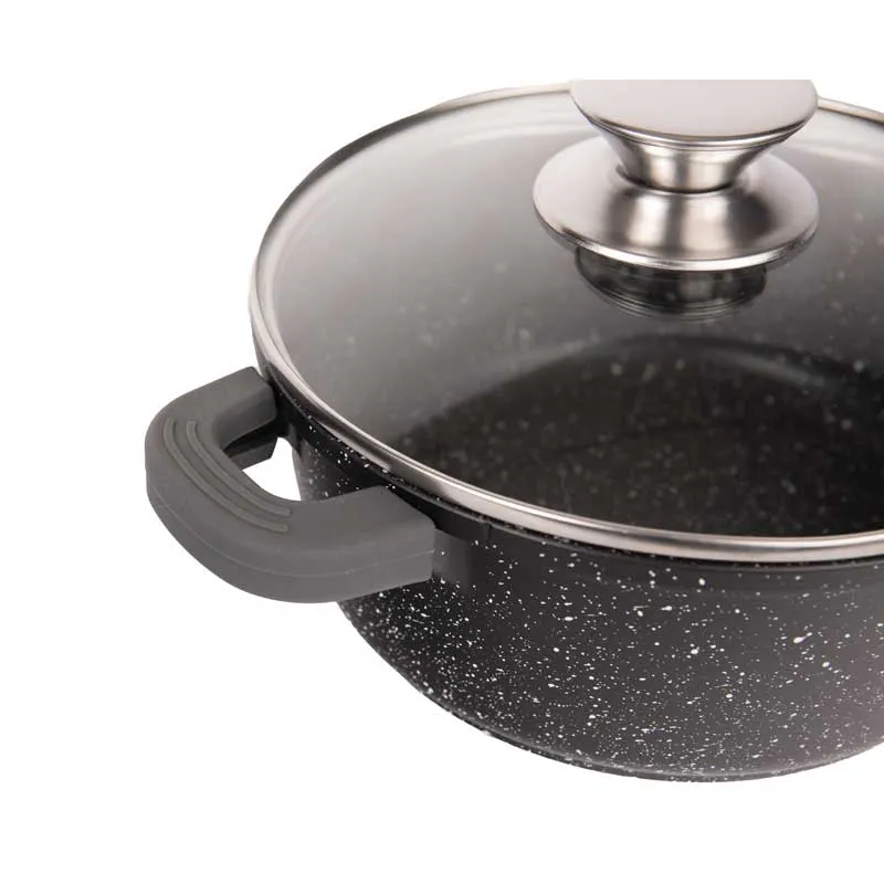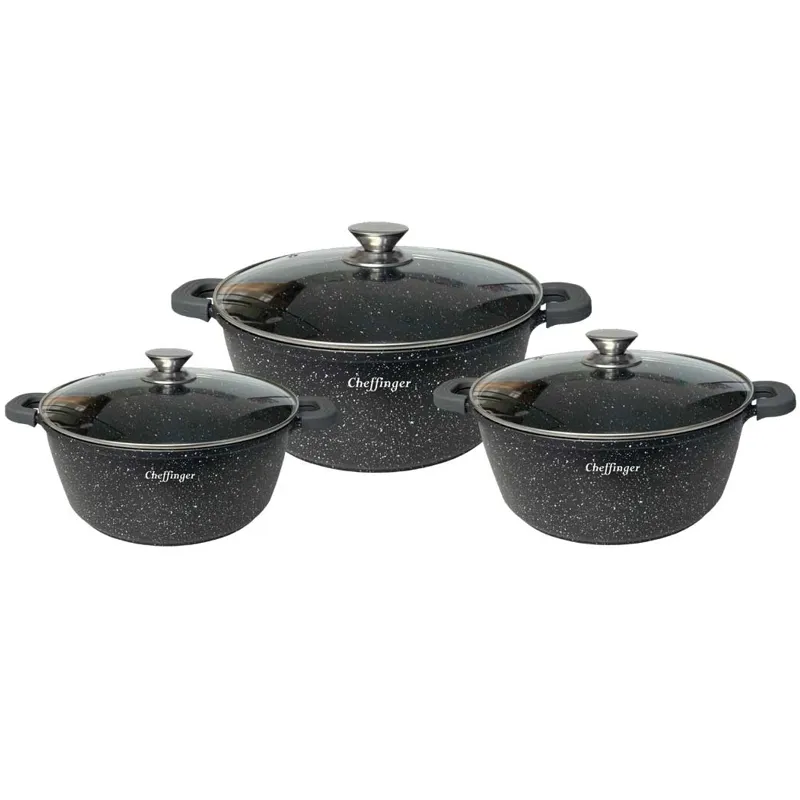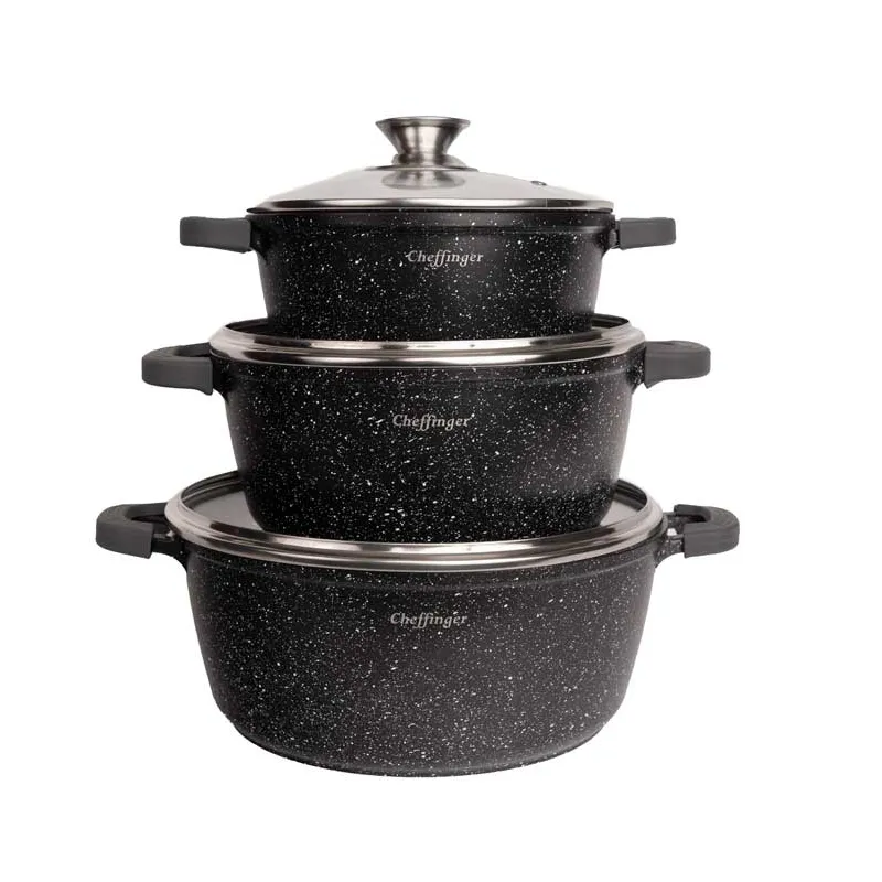 Cu setul de oale din 6 piese Cheffinger poti gati cele mai delicioase mancaruri. Acest set include 3 oale cu capace din sticla termorezistenta. Oalele sunt fabricate din aluminiu cu un finisaj din marmura in 3 straturi.