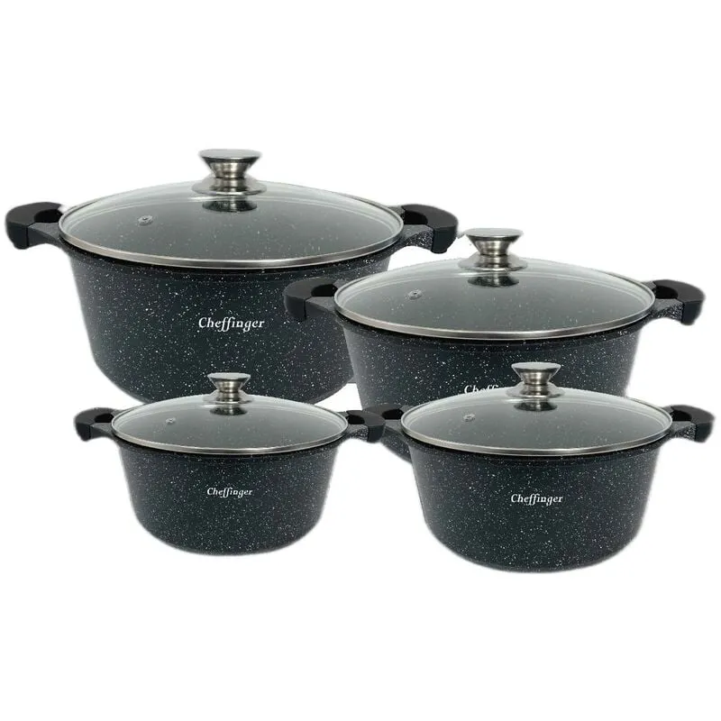 Cu setul de oale din 8 piese Cheffinger poti gati cele mai delicioase mancaruri. Acest set include 4 oale cu capace din sticla termorezistenta. Oalele sunt fabricate din aluminiu cu un finisaj din marmura in 3 straturi.